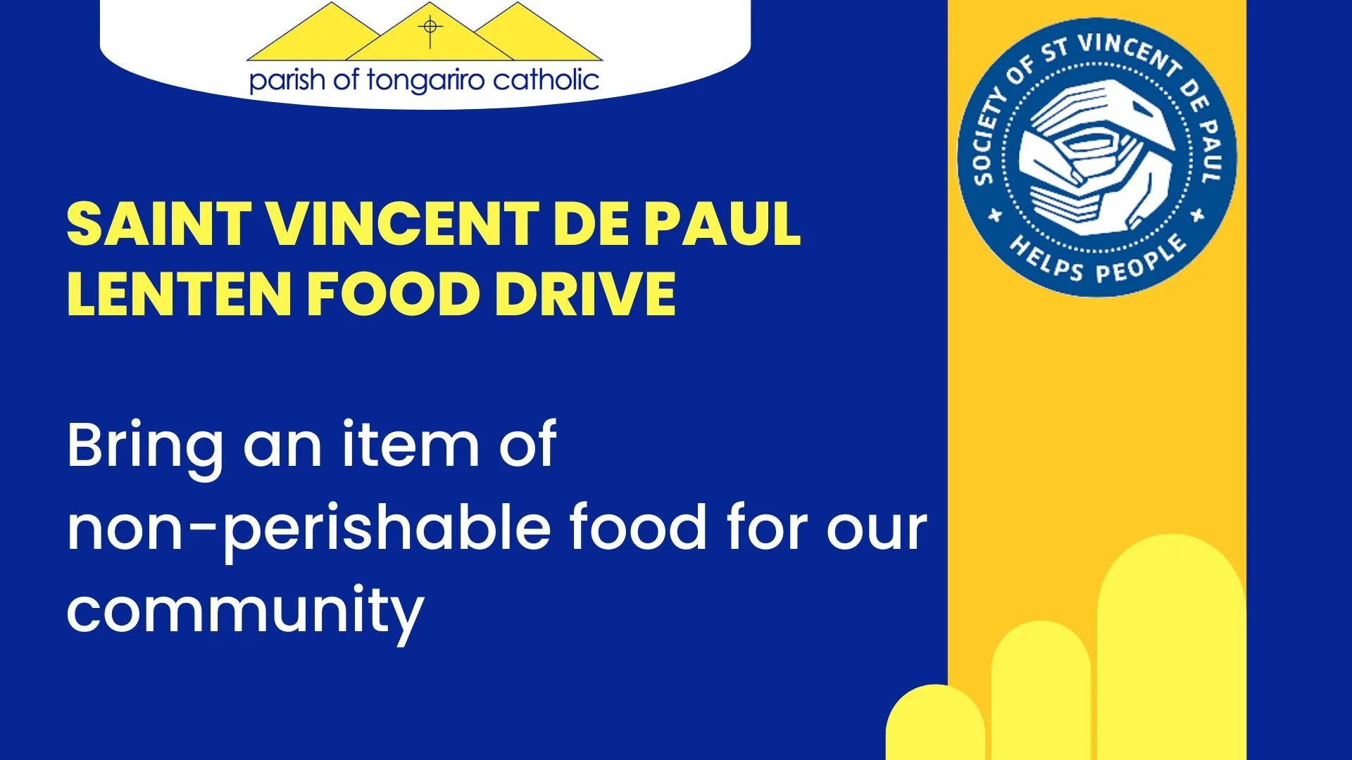Please place your donations in the St Vincent de Paul food bins in the foyer. Thank you for making your Lenten journey one of generosity and hope.