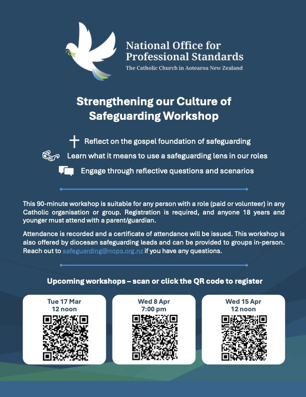 Parishioners are warmly invited to take part in the Lent Webinar Series 2026, a six‑week national online journey with New Zealand’s Catholic Bishops. Through prayer, reflection and sharing, Caritas and the Bishops of Aotearoa invite you to join us for a journey through Lent, in the light of the Gospel and the needs of our world. Hear what the Lord is asking of us in our moment of time. Each session includes guided reflection, insights from Catholic social teaching, and moments for quiet contemplation as we prepare our hearts for Easter.