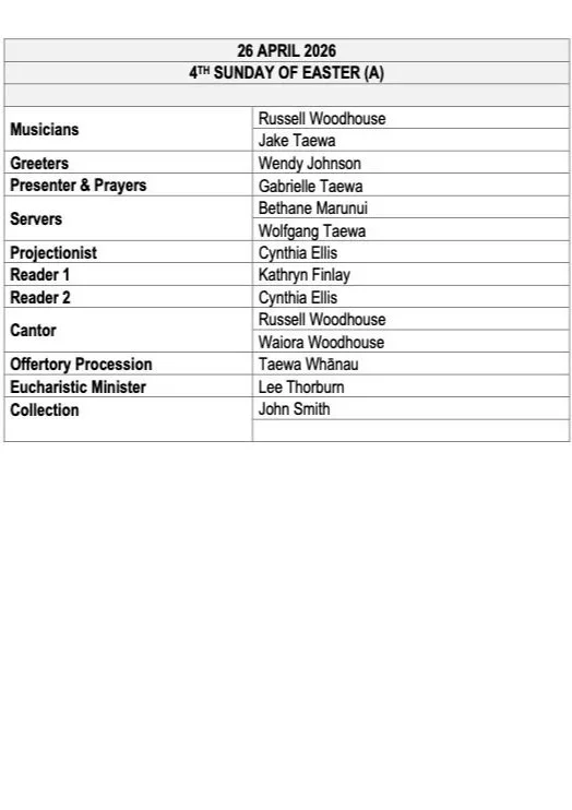 Questions? office@tongarirocatholic.nz or contact Sue 027 555 3339